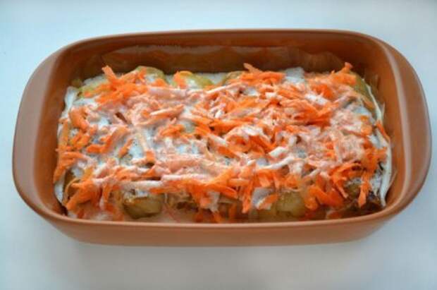 9. Сверху уложить натертую морковь и полить постным майонезом. Если он густой, развести его водой.