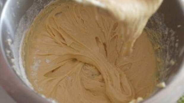Затем постепенно всыпаем просеянную с разрыхлителем и щепоткой соли муку. Получится довольно густое тесто.
