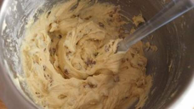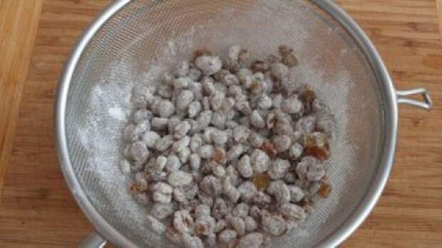 Немного просохший изюм пересыпаем двумя ложками муки. Вмешиваем изюм в тесто.