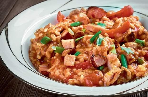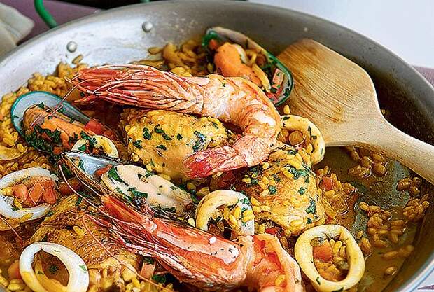 1 Рис с морепродуктами (Arroz a la marinera). В отличие от паэльи это блюдо напоминает скорее похлебку. К рису добавляют кусочки рыбы, креветки, мидии и подают в густом бульоне, сдобренном перцем, чесноком и томатами.