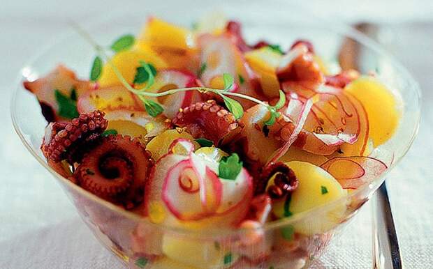 2 Жареный осьминог (Frita de pulpo). Отварные щупальца осьминога обжаривают в оливковом масле с луком, красным сладким перцем и картофелем.