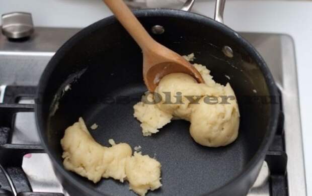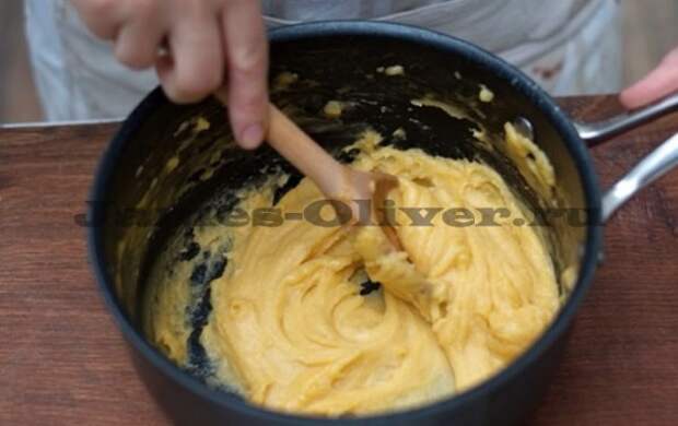 6. Поместите кастрюлю назад на горячую плиту приблизительно на 30 секунд и перемешайте тесто в кастрюле. Затем выключите плиту и дайте тесту для эклеров охладиться в течение нескольких минут.