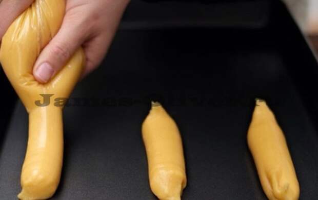 10. Теперь выдавите на противень с антипригарным покрытием тесто в 6 полос как показано в рецепте на фото, оставляя не менее 5 см между каждым эклером.