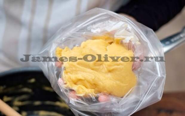 9. Разложите смесь в кондитерский мешок (или используйте обычный прозрачный пакет, Джейми Оливер изобретает на ходу если нет необходимых кухонных принадлежностей), затем отрежьте уголок, у вас должно получиться отверстие примерно 2 см шириной.