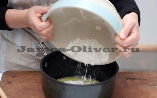 4. Когда смесь воды и масла начнёт кипеть, нужно высыпать в кастрюльку муку и снять её с плиты.