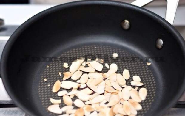 12. Поджарьте хлопья миндаля на маленькой сковороде при низкой температуре до слегка золотистого цвета.