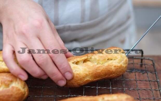 13. Как только эклеры испеклись, нужно переложить их на решётку и проколоть каждый с концов, что бы вышел пар.